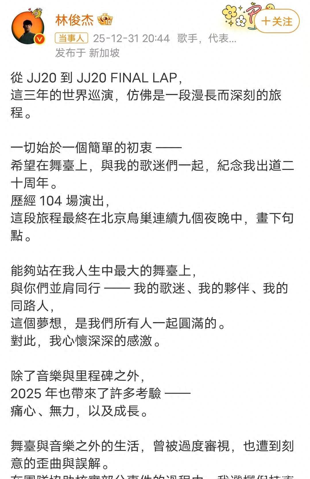 2025年12月31日,林俊杰在社交平台发布长文,首次正面回应与女友七七的恋情争议。他坦言,过去一段时间围绕其私生活的讨论已演变为“有预谋的抹黑行动”,为避免误解升级,自己一度“只能选择沉默”。这番回应将此前持续发酵的舆论战推至高潮。