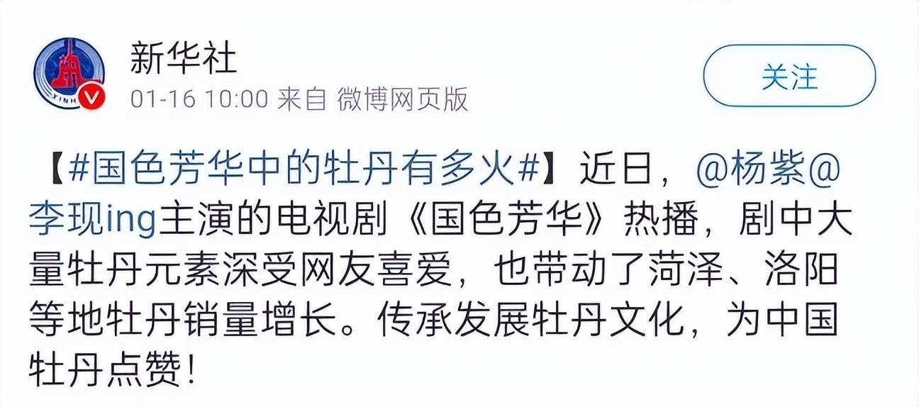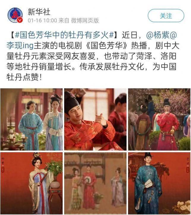 除此之外,新华社还曾晒出《国色芳华》多张剧照,称因其热播带动了菏泽、洛阳等地牡丹销量增长。