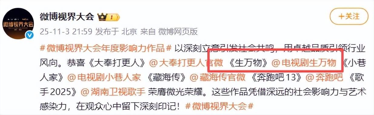 11月3日,该剧更是荣获2025微博视界大会年度影响力作品。
