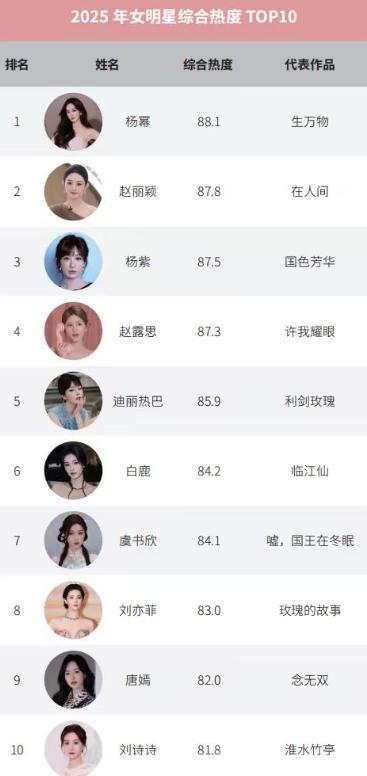 官方发布2025女星热度排名:刘亦菲第8,杨紫第3,第一无悬念